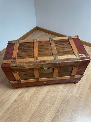 Precioso baúl antiguo de madera, ideal para decoración o almacenaje. Se encuentra en buen estado, con detalles estéticos que le dan un encanto único. - Tiene un diseño clásico y elegante. - Sus herrajes metálicos son resistentes y decorativos. - Perfecto para dar un toque vintage a tu hogar.