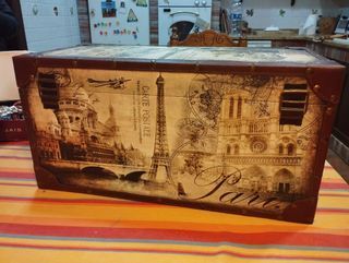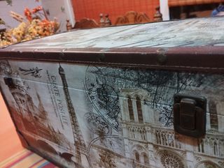 Baúl de madera, decorado con motivos parisinos. Tiene sus tiradores laterales. Le falta una parte de un cierre de la tapa, pero es imperceptible. Las bisagras cierran perfectamente. En las fotos aparecen las medidas. Tanto la estructura, la pintura decorativa, las tachas y el cuero de los ribetes está en perfecto estado.