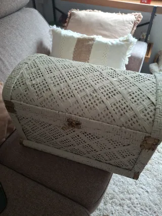 Este baúl combina la calidez de la madera con la textura natural del mimbre. - Diseño clásico con tapa. - Frontal y tapa en mimbre. - Laterales y estructura en madera. - Dos cierres metálicos frontales. está en buen estado, sólo está sucio Se recoge en calle Naves, Madrid o cerca de Brihuega