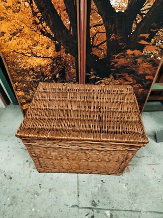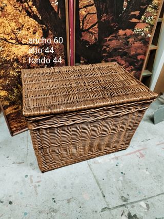 Precioso baúl decorativo de estilo vintage. Ideal para guardar pequeños objetos o como elemento decorativo. - Está hecho de mimbre y madera, con un diseño rústico y elegante. - Tiene un asa de cuero sintético para facilitar su transporte. - Se encuentra en muy buen estado. Si quieres también el otro cofre que tengo en venta, te hago precio. No se hacen envíos.