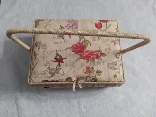 Bonito costurero usado con un diseño floral y de frutas. ( Costurero tapicería francesa / cesta de paja parisina ) - Decoración con motivos florales y de uvas. - Cierre con lazada. - Acabado exterior en mimbre tejido. - NO SE ENVÍA, SOLO VENTA EN MANO.