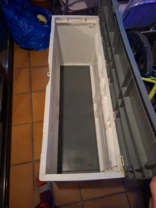 Se vende arcón de almacenaje fabricado en resina de color gris antracita. Ideal para jardín, terraza, garaje o incluso trasteros. Es muy robusto y perfecto para guardar herramientas, cojines de exterior, juguetes de piscina o artículos de limpieza. Características principales: Material: Resina resistente a la intemperie (no se oxida, no necesita mantenimiento). Seguridad: Incluye pestaña frontal para poder poner un candado (ver fotos). Transporte: Dispone de asas laterales integradas para moverlo fácilmente. Estado: Muy poco uso. Sin roturas ni grietas. Interior impecable. Largo 118cm Altura 57 Ancho 39'5
