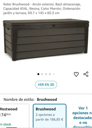 Faltan los amortiguadores y el libro con las instrucciones.! Keter Brushwood - Arcón exterior, Baúl almacenaje, Capacidad 454L, Resina, Color Marrón, Ordenación jardín y terraza, 69.7 x 145 x 60.3 cm Marca Keter Color Marrón Material Polipropileno Inyectado / Madera Función especial Apilable Estilo Brushwood