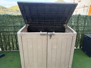 la última foto es de Internet, tengo que subir más fotos reales. Arcón de resina con diseño de lamas de madera, ideal para exterior o interior. muy buen estado, solo tiene polvo de estar bajo cubierto en una pergola. no está roto ni descolorido. precio leroy 139e. se entrega desmontado con los tornillos. disponible otro en iguales condiciones excepto la tapa que tiene un apaño. no afecta al uso. 1x100e 2x160e no envio ni rebajo. gracias. - Material: Resina. - Color: Beige/Madera. - Uso: Jardín, terraza o garaje.