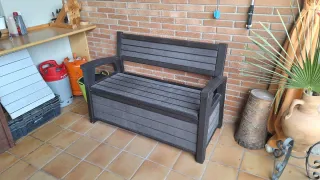 la última foto es de Internet, tengo que subir más fotos reales. Arcón de resina con diseño de lamas de madera, ideal para exterior o interior. muy buen estado, solo tiene polvo de estar bajo cubierto en una pergola. no está roto ni descolorido. precio leroy 139e. se entrega desmontado con los tornillos. disponible otro en iguales condiciones excepto la tapa que tiene un apaño. no afecta al uso. 1x100e 2x160e no envio ni rebajo. gracias. - Material: Resina. - Color: Beige/Madera. - Uso: Jardín, terraza o garaje.