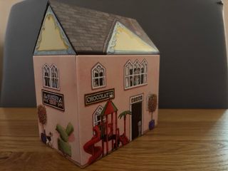 Encantadora caja metálica con diseño de casita, ideal para guardar dulces o chocolates. Su exterior está decorado con detalles que evocan una tienda. - Diseño de casita de dulces. - Acabado en tonos rosas y marrones.