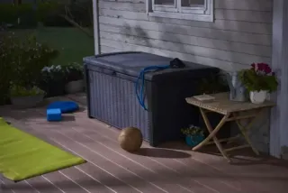 Arcón de exterior Duramax con acabado en gris y tapa plateada. Ideal para almacenar herramientas o cojines. Arcón de jardín Compact Box 1450l antracita Código del producto: DX71273 Peso (kg): 75 Color: Antracita Impermeable: Sí Posibilidad de sentarse: No Lugar para un candado: Sí Mecanismo de ayuda a la apertura: Sí