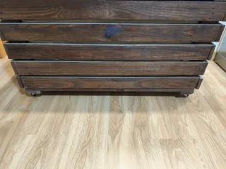 Baúl de madera muy resistente, hecho a mano, con dos cajones ocultos laterales, interior cubierto con tela . Medidas exterior: Ancho 100,5 cm Alto 58 cm Fondo 45 cm. Medidas interior: Ancho 97 cm Alto 45,5 cm Fondo 42 cm. Tiene ruedas para facilitar su desplazamiento y también dos asas laterales. Es perfecto para ponerlo en una terraza y guardar muchas cosas dentro teniendo en cuenta que tiene gran capacidad de almacenaje. Aseguró transporte dentro de Zaragoza ciudad.