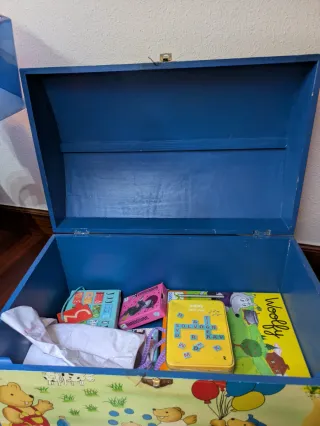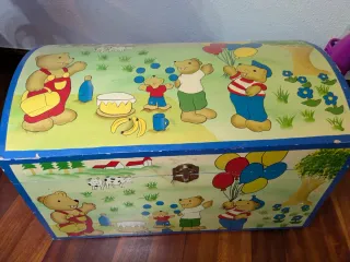 Este baúl de madera es perfecto para guardar juguetes y tesoros. - Diseño pintado con ositos y escenas infantiles. - Tapa curva. - Ribete azul en los bordes. Tiene alguna muesca en la pintura.