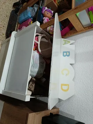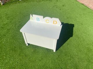Este baúl de madera es un práctico y decorativo mueble infantil. Sirve para guardar juguetes, zapatos, etc, muy práctico! También se puede poner cojines encima y se pueda sentar. Tiene marcas del uso. Tengo dos iguales, se venden juntos o separados. URGE VENDER, ESCUCHO OFERTAS - Diseño con letras A, B, C, D. - Acabado blanco.