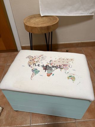Original baúl infantil con un diseño único de mapa mundial. Incluye tambien un Cuadro mapa mundial really nice things Surdic. Decorados los dos con un mapa del mundo multicolor. Madera y tela Cuatro ruedas