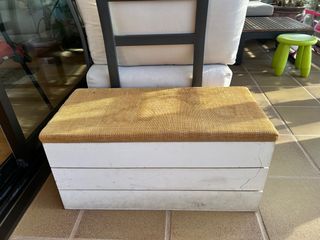 Baúl infantil con tapa de yute y estructura de madera. La tela se deberí de cambiar, tiene algunas manchas, por el resto está genial. - Color blanco y marrón. - Materiales: yute y madera.