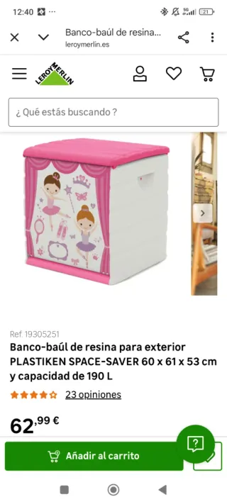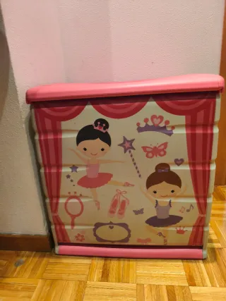 Baúl de almacenaje infantil con un bonito diseño de bailarinas. - Ideal para guardar juguetes o ropa. - Tapa con cierre seguro. - Decoración temática de ballet. - Es para exterior e interior ...siempre ha estado en interior en un domicilio.