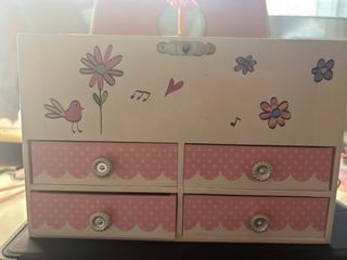 Bonita caja de música para niñas con una figura de bailarina. - Interior forrado en tela rosa. - Compartimento para guardar joyas. - Diseño exterior con flores.