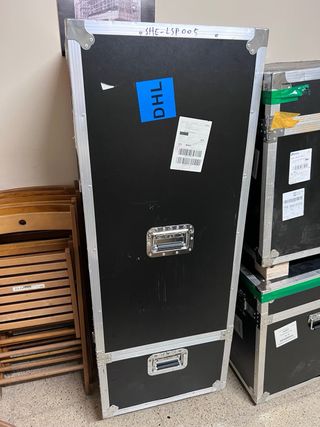Baúl metálico de color gris, ideal para almacenamiento. - Equipado con ruedas para facilitar su movilidad. - Diseño robusto y funcional.