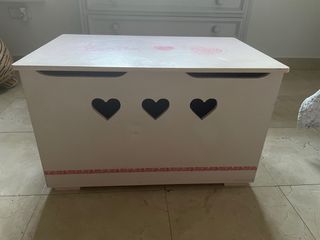 Bonito baúl de madera para niñas, ideal para guardar juguetes. Tiene un diseño delicado con corazones. - Perfecto estado. - Tres corazones recortados en la parte frontal. - Decoración con corazones rosas. - la bisagra y tope para cerrar (en perfecto estado)