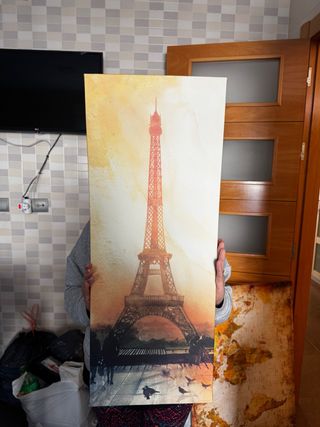 Conjunto de tres cuadros decorativos con un diseño inspirado en la Torre Eiffel. - Diseño artístico con tonos cálidos. - Impresión sobre papel de alta calidad. - Marco de madera.