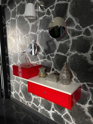 Mueble de entrada con un diseño moderno y funcional. Ideal para organizar tus pertenencias. Incluye dos espejos redondos con bordes rojos - Estructura principal de madera a dos niveles. - Dos espejos redondos