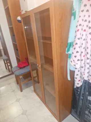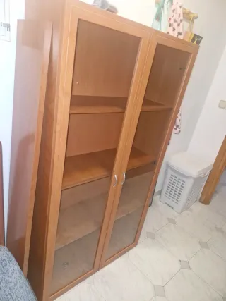 Elegante vitrina con puertas de cristal y estructura de madera. - Diseño moderno. - Acabado en tono madera natural. - Puertas con tiradores plateados. Información por privado recoger en baza