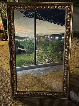 Elegante espejo vintage con un marco dorado, perfecto para añadir un toque de distinción a eventos especiales como bodas y comuniones. - Marco con detalles ornamentales. - Diseño rectangular.