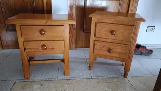Se venden dos mesitas de noche de madera, cada una con un diseño ligeramente diferente. - Fabricadas en madera. - Color marrón natural. - Cada mesita tiene dos cajones con tiradores redondos. Se pueden vender por separado, 30€ unid.