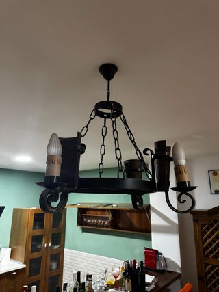 Elegante conjunto de lámparas de estilo rústico, combinando metal y madera. - Diseño circular con cadenas. - Acabado en negro y marrón.