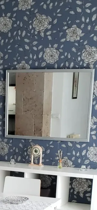Set de espejo con marco plateado y dos cuadros decorativos con diseño floral. - El espejo tiene un marco metálico. - Los cuadros presentan un patrón de flores en tonos azules y grises.