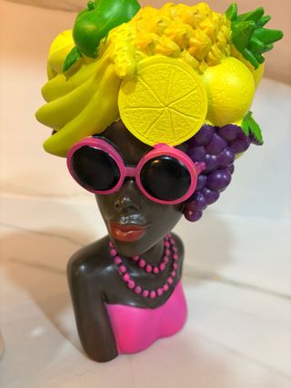 Figura decorativa de una mujer con un tocado de frutas. - Diseño colorido y original. - Detalle de gafas de sol rosas. - Collar de cuentas rosas. - Vestido rosa vibrante.