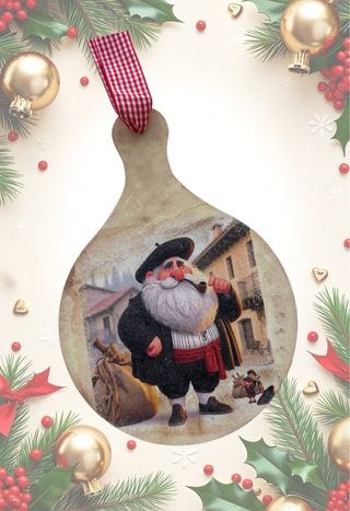 Tabla de madera con diseño navideño, ideal para colgar. - Motivo de Papá Noel con pipa y saco. Olentzero - Borde decorado con ramas de pino y adornos. - Incluye cinta a cuadros para colgar.