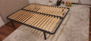 Somier Pikolin de 135x190 cm, listo para usar. - Estructura metálica resistente. - Láminas de madera para un buen soporte. - Patas incluidas para fácil montaje.