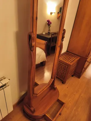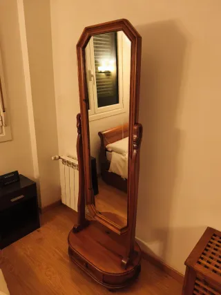 Elegante espejo de pie con un diseño clásico y funcional. Perfecto para cualquier habitación. - Estructura principal de madera. - Incorpora un práctico cajón en la base. - Acabado en tono madera natural. Muy estable y en muy buen estado general, sin roturas ni daños estructurales. Ideal para dormitorio o vestidor. Espejo grande, permite verse de cuerpo entero. ¡Negociable!
