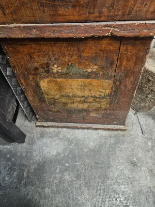 Pieza de antigüedad con un diseño único y decorativo. - Elaborada en madera con incrustaciones de cristal. - Presenta motivos florales pintados a mano.