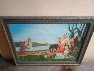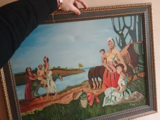 Pintura original sobre lienzo, realizada con técnica acrílica. - Representación de una escena rural con figuras. - Tonos predominantes en azul y marrón.