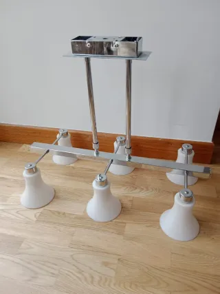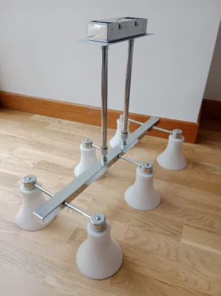 Elegante lámpara colgante con cinco tulipas en forma de flor. Su diseño combina detalles metálicos con acabados en cristal. - Estructura de metal con detalles ornamentales. - Tulipas de cristal blanco con forma de flor.