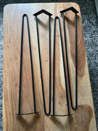 Set de 4 patas de hierro para crear o renovar tu mesa. Su diseño tipo horquilla es moderno y robusto. - Acabado en color negro. - Fabricadas en metal resistente. - 71,5 cm de alto - el triangulo de anclaje es de 11cm x 11cm - la horquilla mide en su parte mas ancha 10,5cm y en su parte mas estrecha (la base) 4cm *la zona de apollo con el suelo esta desgastada por el apoyo (hay foto de muestra)