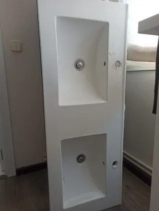 Lavabo plano doble desagüe de diseño moderno, ideal para baños con espacio. - Fabricado en porcelana de alta calidad. - Color blanco. - Dos cubetas integradas. Tiene algun arañazo pero no pierde agua