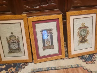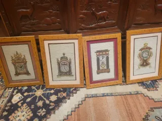 Conjunto de cuatro cuadros decorativos de punto de cruz con motivos de relojes antiguos. - Diseños detallados de relojes. - Marcos de madera con acabado texturizado. - Cada cuadro presenta un diseño único de reloj.