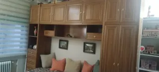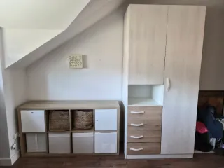 Conjunto de muebles para dormitorio. - Armario de dos puertas con espacio de almacenaje . Medidas : ancho 101cm x alto 215cm x profundidad 50cm - Estantería modular con cubos . Medidas: ancho 146cm x alto 77cm x profundidad 39cm - Cajonera de madera/zapatero: ancho 77cm x alto 41 x profundidad 39cm - Cama nido con lamas (colchón incluido): ancho 210cm x alto 78 x profundidad 99cm (pequeñas manchas típicas de madera tal y como se muestra en las fotos)