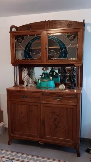 Elegante aparador de estilo modernista con detalles únicos. De principios de siglo XX. - Estructura principal de madera. - Encimera de mármol. - Puertas acristaladas con diseño. - Cajones y compartimentos de almacenamiento. - Uno de los cristales presenta una raja (ver última foto) Medidas - Ancho 128cm, Alto 225cm, Fondo 52cm Se ofrece transporte gratuito para la zona de Madrid.