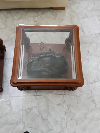Conjunto de dos mesas de centro con un diseño elegante y funcional. Medidas Mesa Larga Ancho 110xalto43xfondo57 - Estructura de madera oscura. - Superficie de cristal. - Patas talladas con detalle.