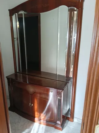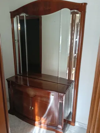 Mueble recibidor de madera con un espejo integrado. Su diseño curvo y los detalles tallados le dan un toque elegante. Un cajón le falta un tirador - Acabado en tono madera oscura. - Espejo con marco de madera. - Puertas con tiradores dorados.