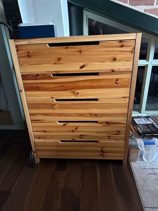 Cómoda de madera de pino con cinco cajones. Su diseño rústico y natural aportará calidez a cualquier habitación. - Cinco cajones amplios. - Acabado en madera de pino.