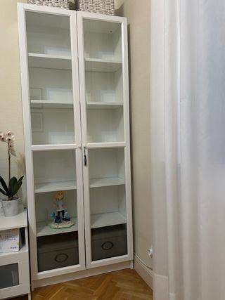 Elegantes vitrinas de almacenaje en color blanco. Perfectas para exhibir o guardar objetos. - Puertas de cristal para visibilidad. - Estructura de madera resistente. - Diseño moderno y funcional.