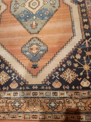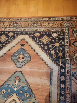Alfombra con un diseño llamativo y colores vibrantes. - Patrón geométrico y floral. - Tonos cálidos y fríos. - Tacto agradable.