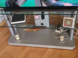 Mueble para televisión con un diseño moderno y elegante. - Superficie de cristal. - Patas y estructura de metal.