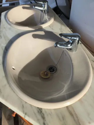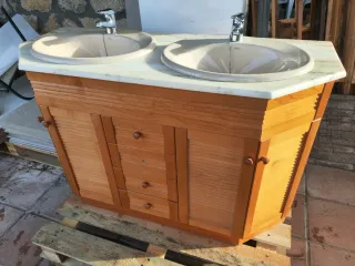 Mueble de baño de estilo retro con encimera de mármol y dos lavabos con griferia. Uno de los cajones se queda algo encajonado. Mejor ver. - Diseño de madera con detalles acanalados. - Incluye tres cajones centrales. - Dos puertas laterales con tiradores de madera. - Encimera de mármol.