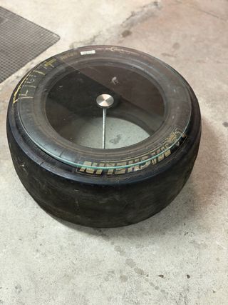 Original mesa auxiliar con base de neumático de carreras Michelin y tapa de cristal. El neumático salió del Circuit de Catalunya hace unos 15 años. - Diseño único y llamativo. - Ideal para salones o garajes. - Combinación de materiales resistente.