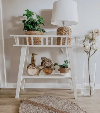 Mesa auxiliar de diseño moderno, perfecta para añadir un toque natural a tu hogar. Pequeño desconche (muestro foto) - Estructura principal de madera. - Acabado en color blanco.