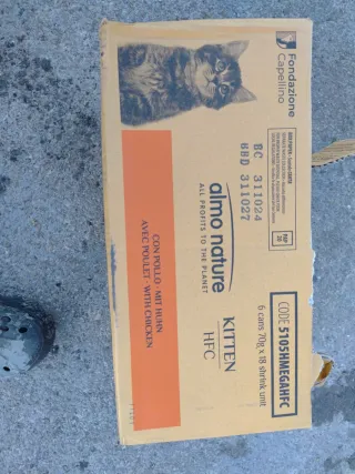 Pack de 6 latas de comida húmeda Almo Nature para gatitos. - Sabor a pollo (Pollo / Mit Huhn / With Chicken). - Formato Kitten HFC. - Cada lata contiene 70g. - Unidad de embalaje de 18 latas.