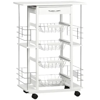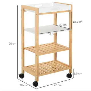 - El acabado en tablero de MDF blanco y madera de pino le dan una apariencia natural y relajada - 1 bandeja superior blanca y 3 estantes para alimentos, vajillas y otros artículos esenciales de cocina - 4 ruedas giratorias para facilitar el movimiento, 2 de las cuales son bloqueables con freno - Material: tablero de MDF, pino - Dimensiones totales: 40x30x76 cm (LxANxAL) - Dimensiones de bandeja superior: 34,5x27,5x4 cm (interior) - Dimensiones de cada estante: 37x30 cm (LxAN) - Carga máxima: 30 kg (total), 3 kg (estante y bandeja) - Referencia: 801-131